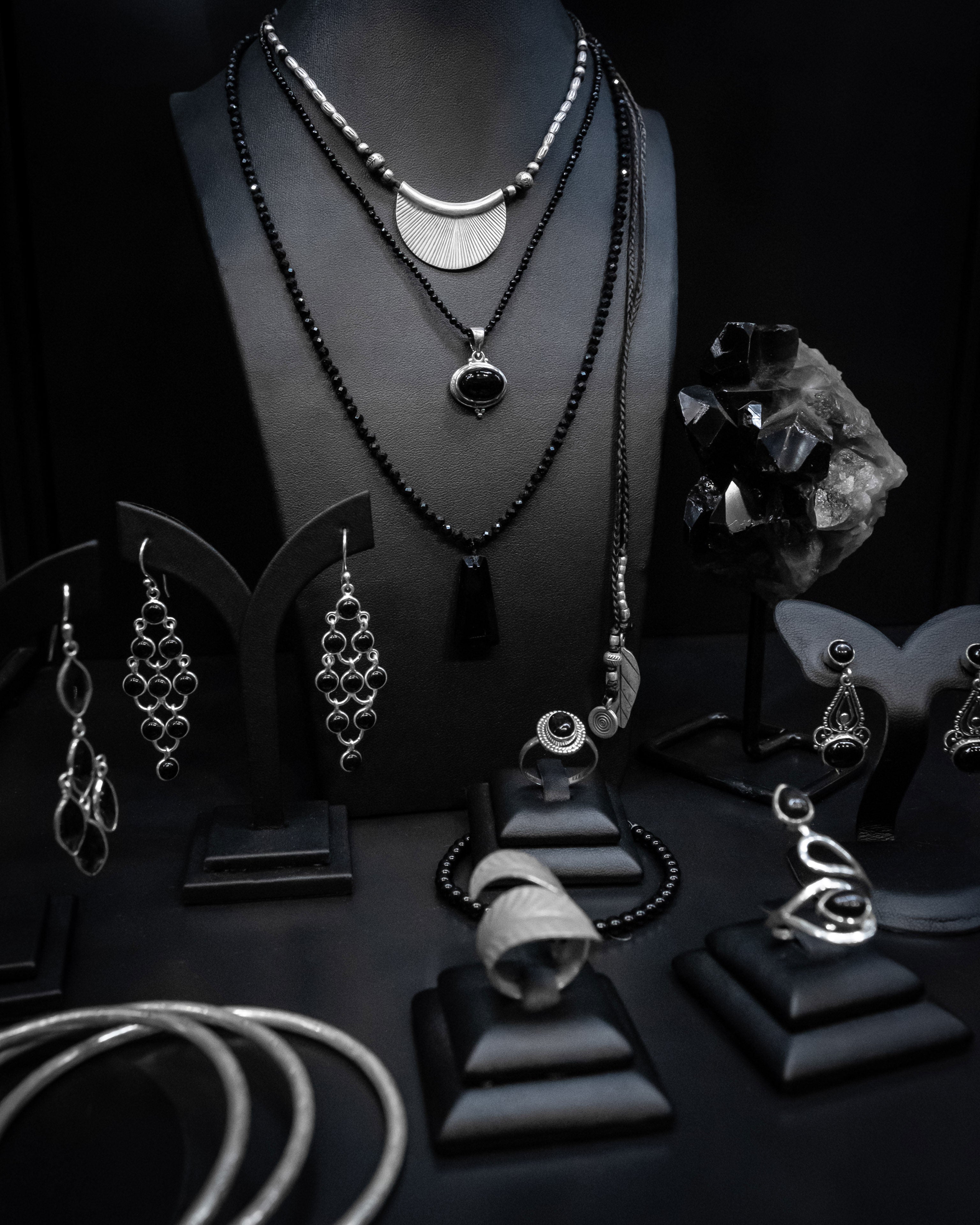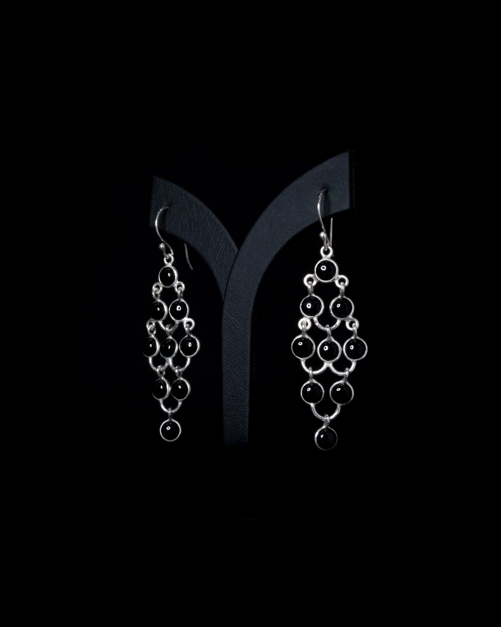 Elegant silver drop earrings adorned with a vertical flow of onyx circles. Designed to move with you while offering g...